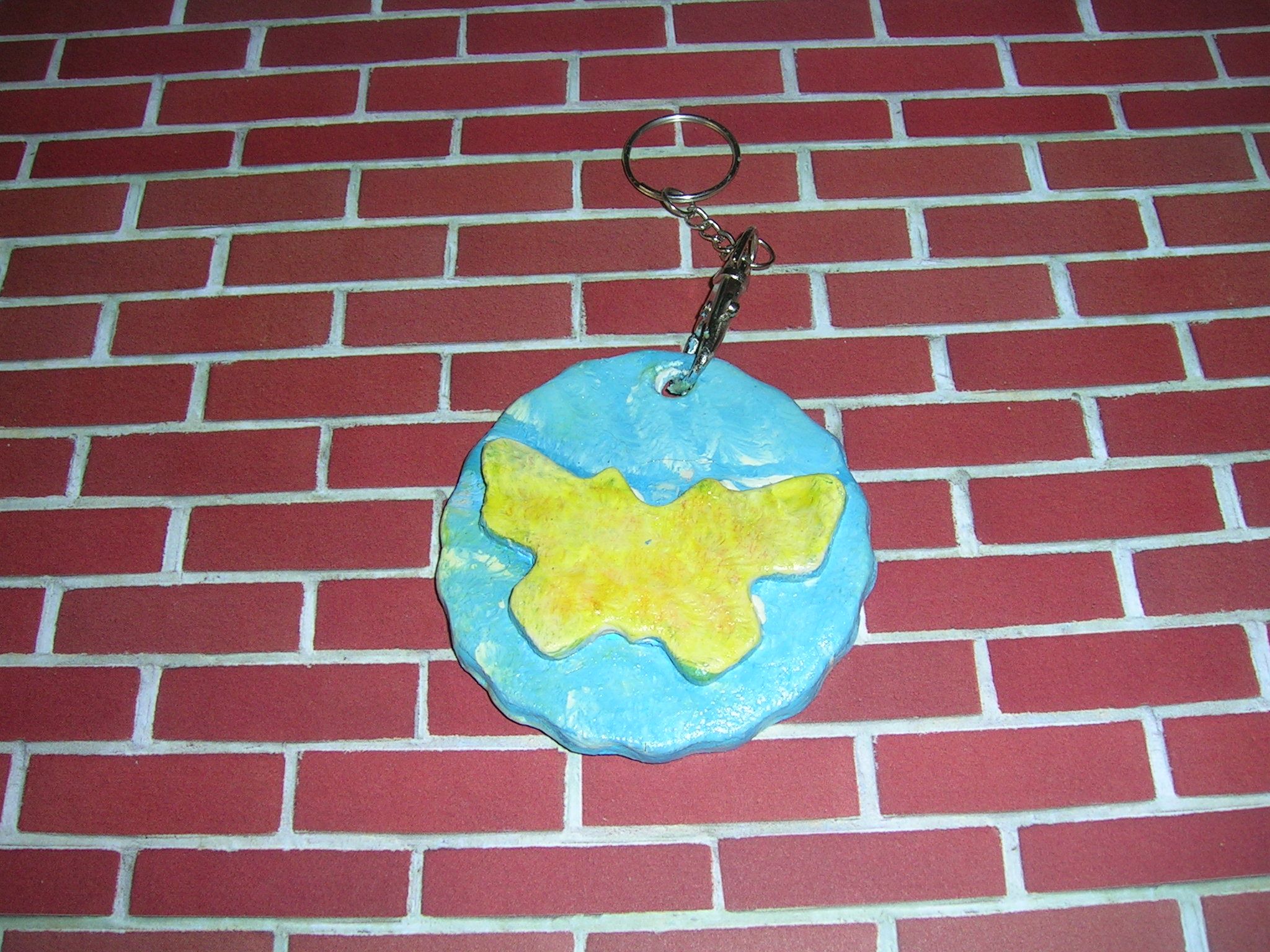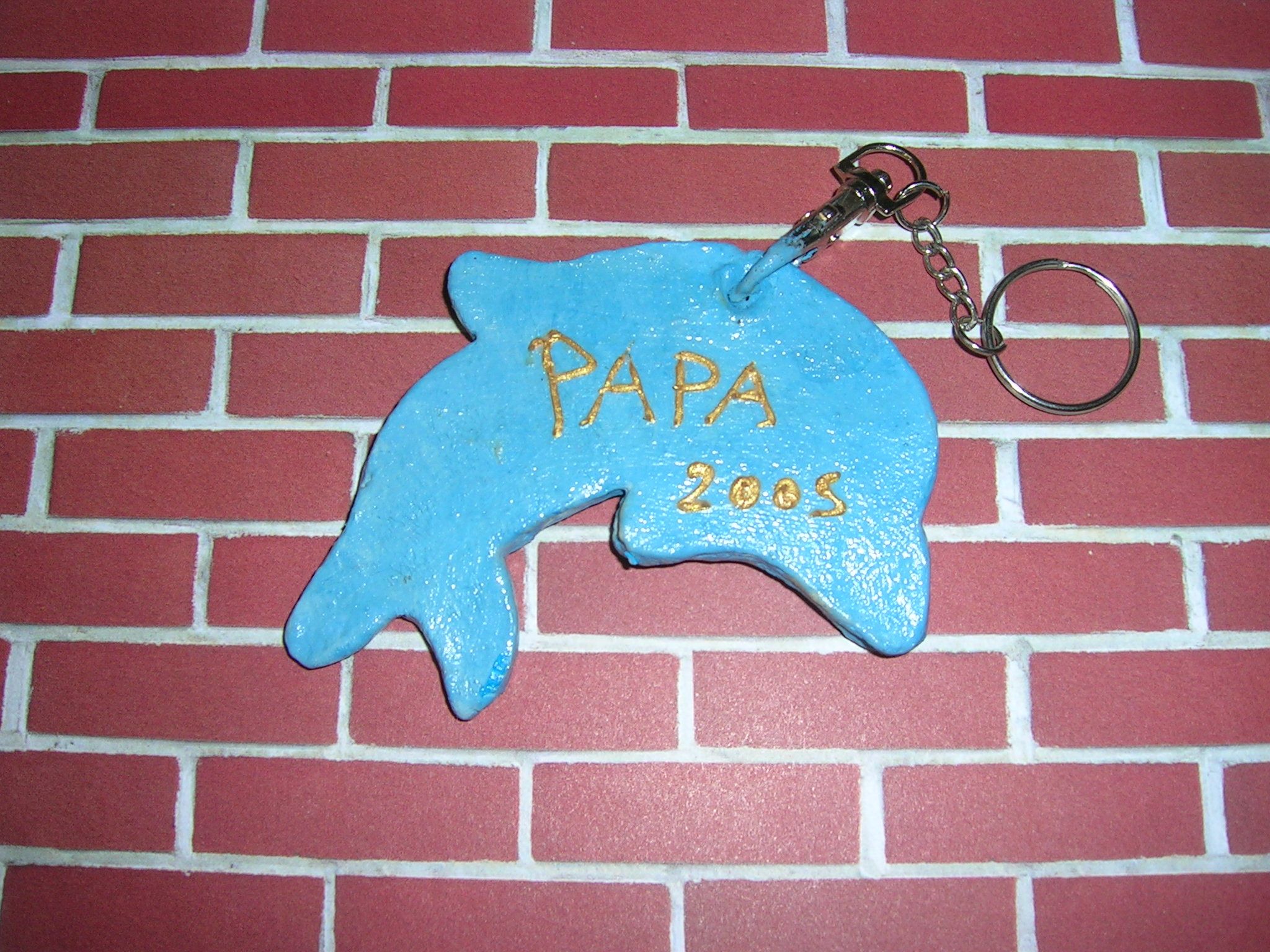 Faire de la pâte à sel et faire la forme qui plaira à l'enfant sans oublier de mettre un cure-dent pour faire le trou pour l'anneau du porte-clé. Une fois sec, le peindre, le vernir et accrocher l'anneau.